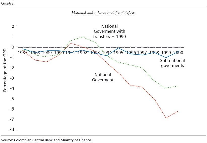 The impact of fiscal decentralization on stabilization has been an issue of great interest during the last decade, especially in Latin American, considering that in different countries such as Brazil and Argentina the increasing sub-national debt has negatively affected macroeconomic adjustment efforts. In the Colombian case, the concern also exists that decentralization has been a source of fiscal and macroeconomic problems, given that after the decentralization process was strengthened, spending and fiscal deficits significantly increased at both sub-national and national levels. The increase in local fiscal deficits was fostered by the fact that, after transfers from central government to the regions and municipalities increased, access to debt was not difficult2. For their part, regional and local authorities were keen to borrow, since this provided a potential source of untied finance and a three-year electoral cycle, with no re-election possible for mayors and local administrations, meant there was relatively little concern about the consequences (Ahmad & Baer, 1997, p. 481).