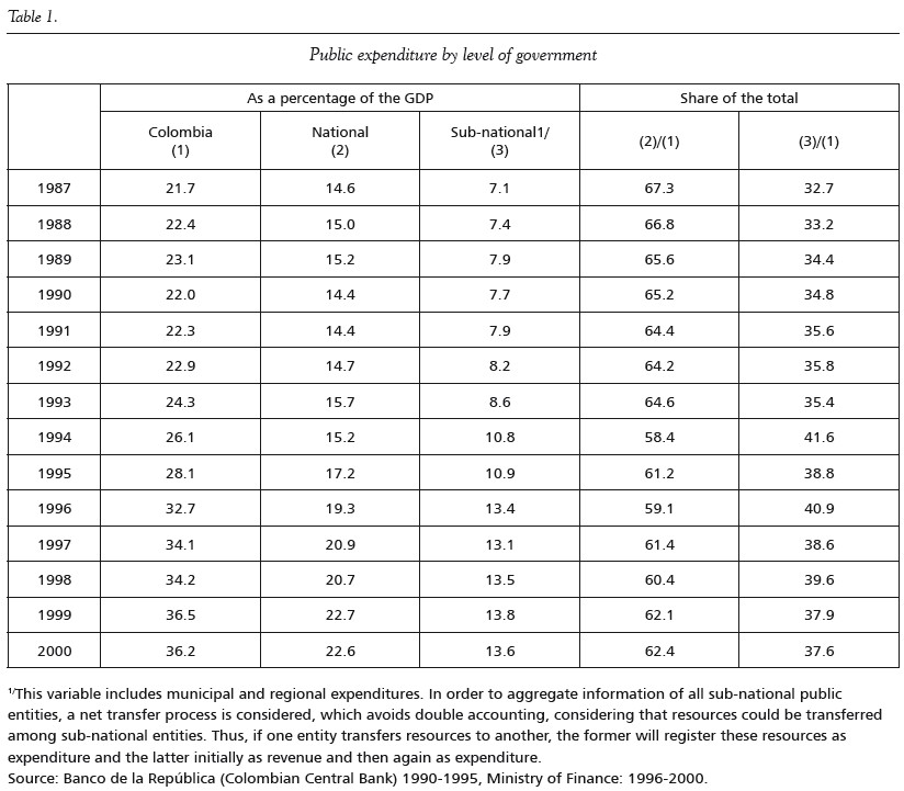 With respect to public expenditure, it is worth pointing out that both national and sub-national spending increased significantly in the period under examination. In particular, national government expenditure expanded by 10 points of GDP in ten years, increasing from 11.0% in 1990 to 21.1% in 2000. In Colombia, considering that transfers of resources from central government to the subnational public sector increased from 2.8% of GDP in 1993 to 5.7% in 1999, some analysts have blamed fiscal decentralization for the rapid increase in public expenditure and its negative consequences for fiscal and macroeconomic policy.