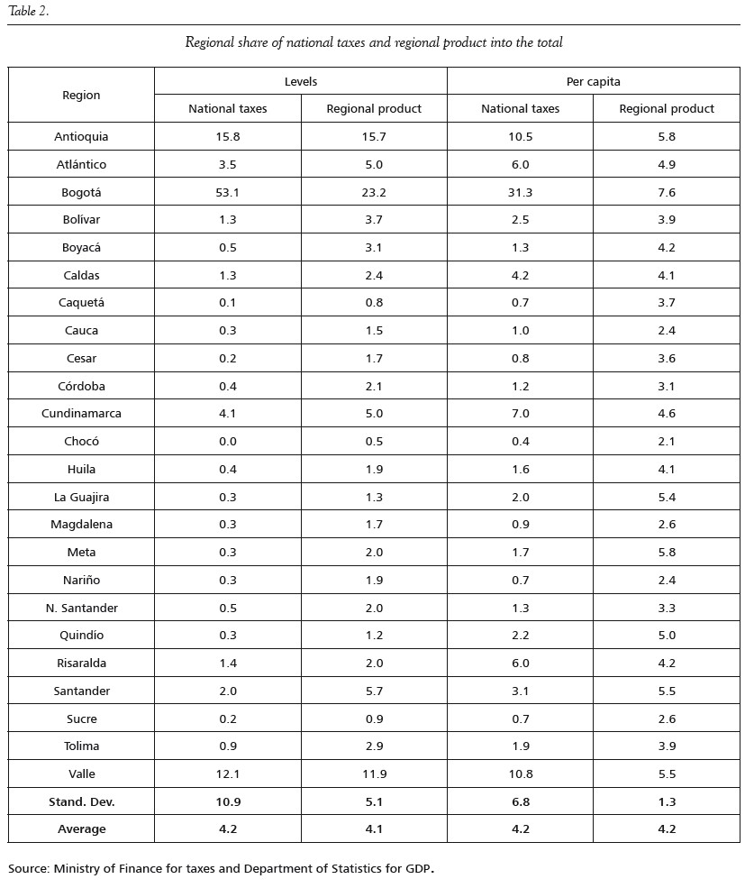 As before, j indicates regions and N denotes national taxes and GDP respectively. Taking into account that the regional share of national taxes and product in the total tax levels of the country is significantly different in per capita terms and in terms of absolute payment levels, different specifications were considered. In fact, as can be seen from Table 2, although on average the regional share of taxes and of GDP is approximately equal to 4.2% in all cases, the standard deviation varies widely. The greatest variation is observed in the case of national tax levels, reaching 10.9, and the lowest in the case of the economic product in per capita terms (at 1.3). This variation is explained by the heterogeneity across regions and, in particular, by the fact that while the collection of national taxes is concentrated in Bogotá, per capita GDP has a more homogenous distribution across the regions than does total GDP.