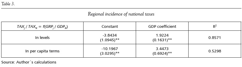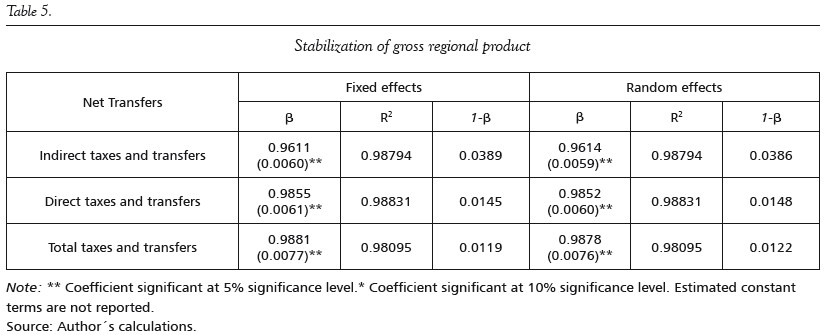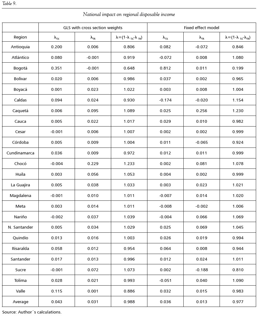 Finally, in order to analyze whether the national government actually absorb regional shocks, following Sala-i-Martín & Sachs (1992), the estimated elasticities are evaluated at the average levels of income, taxes and transfers and then l is calculated. Thus, when income changes by one peso, taxes change by λTX = βTX*TXj/Yj and transfers change by λTR = βTX* TRj/Yj is the average tax rate and TRj/Yj is the average transfers received by the region. Disposable income for region i increased by λ = (1-λTX - λTR) cents after a one peso shock to that region's income.