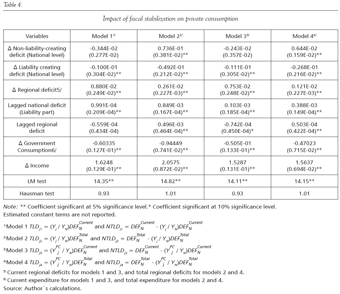 A Keynesian framework would predict that an increase in deficits would have a positive effect on aggregate demand, implying that, φ,η > 0. As Modigliani, (1987: 105) maintains, the size of the increase depends on the source of change in the deficit. Nevertheless, according to the classical view, the response in consumption terms can become negative as the fiscal deficit increases, given that higher government debt lowers capital accumulation. Thus, according to the model, it is expected that NTLD should have a larger positive, or a smaller negative, impact on sub-national consumption with respect to the regional deficit and NTLD. This implies that λ should be greater than φ,η. Since, the liability-creating part of the national deficit is assumed to be subject to Ricardian equivalence, as consumers anticipate the future impact of the deficit on their taxes, a small impact in consumption is expected to occur as this kind of deficit increases. By contrast, the non-liability-creating part of the deficit does not generate any expectation of future regional tax liabilities, so that this part of the deficit should have a larger impact on the stabilization policy. For their part, the coefficients of the pre-existing levels of debt are expected to be negative. The coefficient of government consumption should also be negative, while the coefficient of income is predicted to be positive.