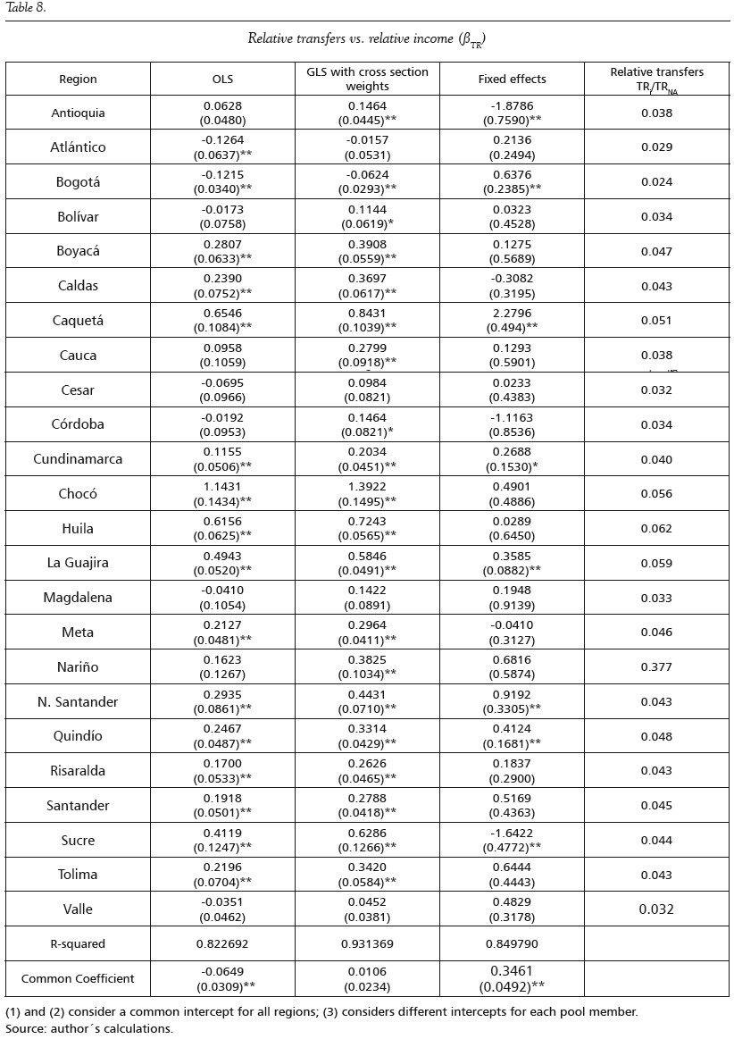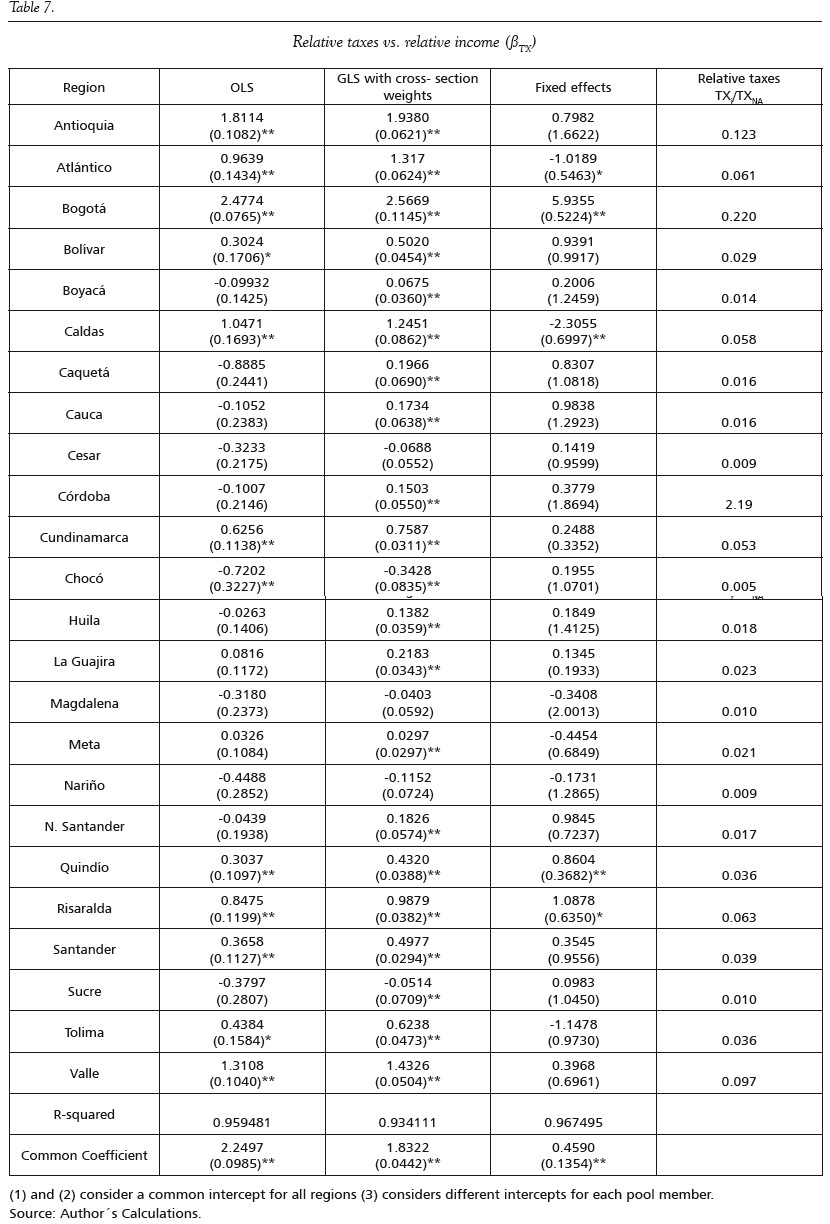 From Table 7, it is apparent that coefficients of βTX register large variations across regions using each of the three different methods that were used. According to the results, when observations are not weighted, there is a significant positive relationship between relative taxes and relative income, when the share of national taxes in the region is greater than 3%. The coefficient is not significant when this share is less than 2.2% and greater than 0.5%; in the case of Chocó, where the share is 0.47%, the relationship is negative and significant. When observations are weighted, coefficients are positive and significant when taxes from the region represent more than 1.4% of the total national tax take. Coefficients that are not significant are observed in regions where this share is around 1%; as in the previous case, the coefficient of Chocó is negative and significant. Under the fixed effect method, no particular pattern is observable with respect to the share of taxes in each region. In this case, the largest βTX coefficient corresponds to Bogotá (5.935), which, in turn, has the largest per capita share of national taxes in the country.