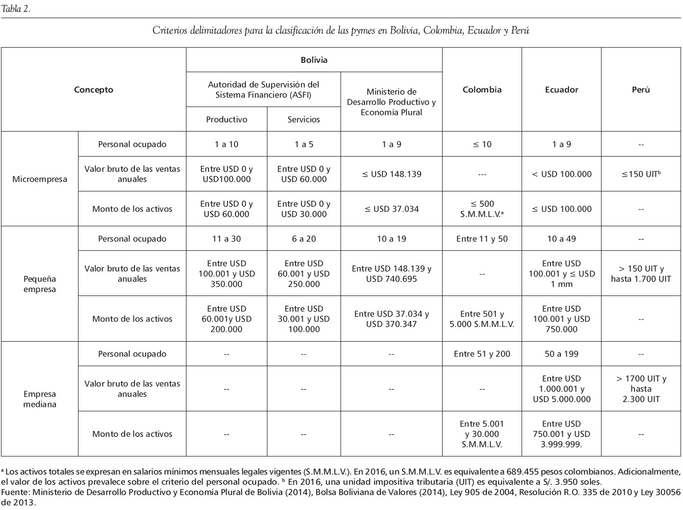 Es importante aclarar que, a pesar de existir una clasificación para las pymes propuesta por la CAN, exceptuando a Ecuador, los países que integran esta Comunidad tienen sus propios criterios y umbrales delimitadores. En Colombia se utilizan el volumen de activos y el número de trabajadores, mientras que Perú decidió en 2013 acoger únicamente el criterio del volumen bruto de ventas. En Bolivia la situación es más compleja, pues diferentes organismos tienen distintas clasificaciones o diferentes umbrales, tal como se puede apreciar en la tabla 2, donde también se puede observar que entre los países de la CAN persisten las diferencias en el establecimiento de los criterios para la clasificación de las pymes, los cuales a su vez inciden sobre la aplicación de las políticas públicas de fomento.