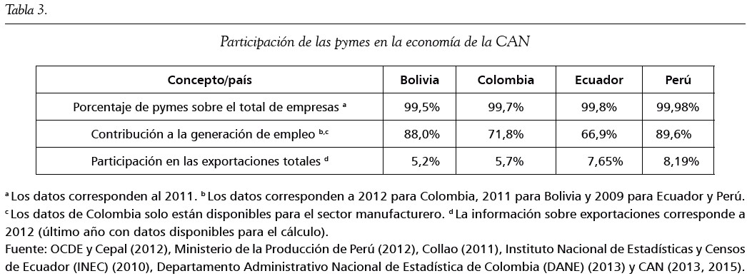La CAN no dispone de estadísticas consolidadas sobre el número de pymes o su participación en la generación de empleo, pero es posible inferir estos datos a partir de la información de los países que la integran (tabla 3). Haciendo un promedio simple de los datos correspondientes a los países de la CAN, se podría decir que las pymes representan aproximadamente el 99% de las empresas de esta Comunidad y generan entre el 71,8% y el 89,6% del empleo; datos que se asimilan a los presentados por este mismo segmento empresarial en la UE. Sin embargo, cuando se analiza la participación de las pymes en las exportaciones, la diferencia es significativa: mientras las pymes de la CAN alcanzan entre el 5% y el 8% de las exportaciones totales de la región, las exportaciones de sus homólogas de la UE se sitúan alrededor del 30%, con lo cual queda en evidencia la escasa propensión exportadora de las primeras.