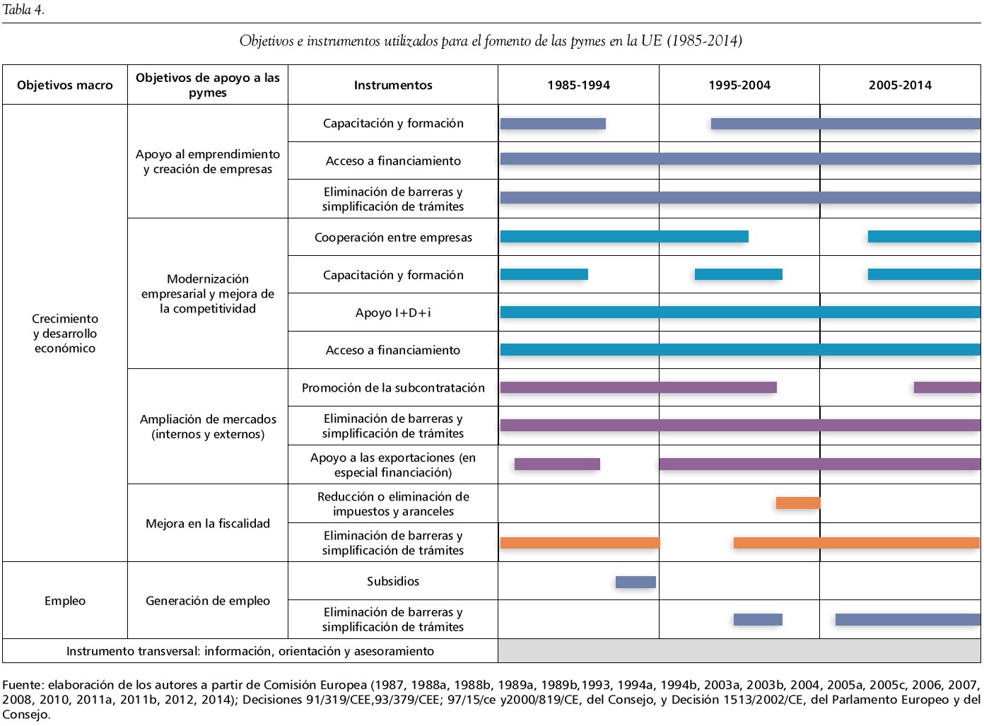 Cada instrumento se ha revisado con el fin de establecer la continuidad (o falta de esta) a lo largo del periodo analizado. En primer lugar, la revisión se hizo para la UE, donde se evidenció que desde 1985 han persistido como principales instrumentos la capacitación y formación, el acceso al financiamiento, el soporte a la I+D+i y el apoyo a la cooperación empresarial. Adicionalmente, la eliminación de barreras y la simplificación de trámites, así como la información, la orientación y el asesoramiento, podrían considerarse como instrumentos transversales que se mantienen incluso desde los años previos a los abarcados por este estudio.