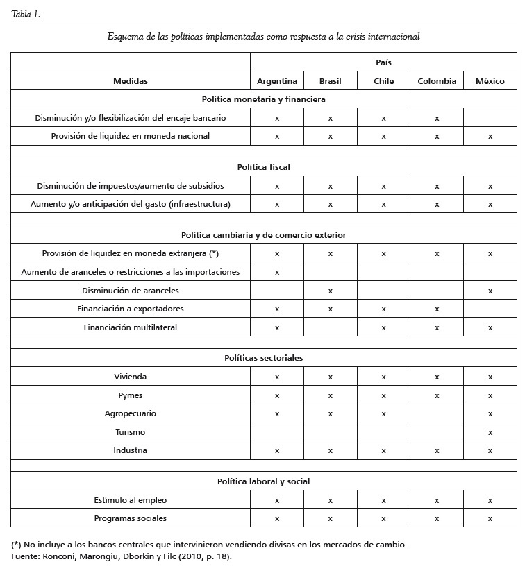 Por ende, los esfuerzos de las políticas públicas adoptadas por estos países ante las crisis económicas y sociales se encaminan en varios frentes: a) sostenimiento de las fuentes generadoras de empleo; b) desarrollo de reformas tributarias (carga impositiva); c) estimulación de la producción industrial y agropecuaria, a través de créditos con tasas moderadas, acciones económicas y fiscales a largo plazo; d) disciplina fiscal en temas de déficit y gasto público, y e) infraestructura social y económica-productiva; la primera, enfocada a mejorar las condiciones habitacionales, como vivienda, agua, riego, drenaje y saneamiento; la segunda, orientada a comunicación y transporte (mantenimiento y extensión de la red vial, puentes, conexiones viales, puertos, ferrocarriles, transporte urbano e interurbano, aeropuertos), energía (generación y transporte de energía eléctrica y renovable y minería) y medioambiente (gestión y conservación de recursos naturales).