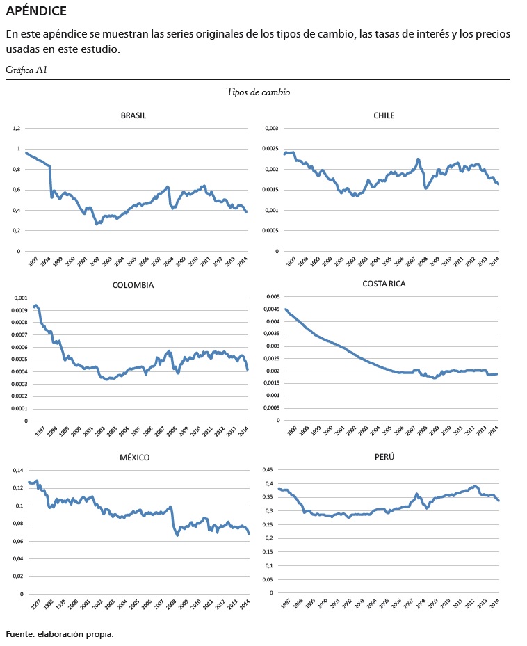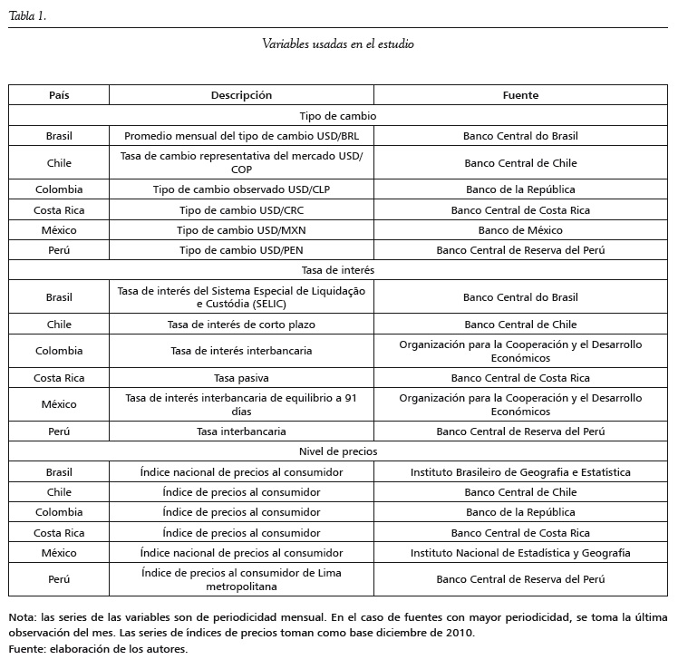 En este estudio se utilizan series mensuales de los tipos de cambio, las tasas de interés y los precios de Brasil, Chile, Colombia, Costa Rica, México y Perú entre enero de 1997 y diciembre de 2014. Las series usadas son aquellas para las que existen datos completos para el periodo. Por convención, las series en niveles transforman las variables originales en términos del logaritmo natural del valor nominal Vde la variable ien el mes t, lnVit. Las series en diferencias miden las variaciones mensuales de las variables (rit = lnVit -lnVit-1). Así, la base de datos incluye un total de 18 series en niveles y 18 series en diferencias. Particularmente, cada serie en niveles incluye 216 observaciones. La tabla 1 muestra las variables originales usadas en el estudio.
