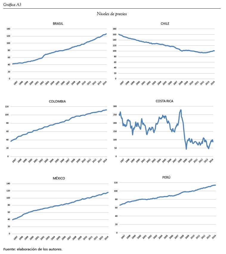 Finalmente, los resultados de esta sección pueden sintetizarse de la siguiente manera: a) durante el periodo analizado, las tasas de interés de Chile han sido las más bajas y las de Brasil han sido las más altas; b) los tipos de cambio de Perú han sido los más estables y los de Brasil han sido los más volátiles; c) los precios de Perú han sido los más estables y los de Costa Rica han sido los más volátiles; d) hay evidencia de cambios estructurales en, al menos, nueve series; e) únicamente Chile no experimentó ningún tipo de cambio estructural; f) la correlación postulada por la hipótesis de Fisher en su versión doméstica solo se cumple para Costa Rica, y g) hay escasa evidencia que confirme las correlaciones de largo plazo postuladas por las hipótesis de Fisher.