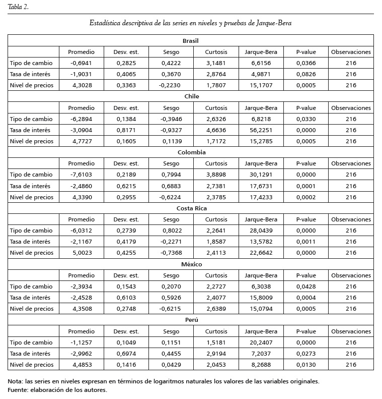 La tabla 2, por su parte, muestra la estadística descriptiva de las series en niveles durante el periodo analizado. Particularmente, la evidencia muestra que, en promedio, las tasas de interés de Chile han sido las más bajas y que las de Brasil han sido las más altas. Asimismo, las desviaciones estándar muestran que los tipos de cambio de Perú han sido los más estables y que los de Brasil han sido los más volátiles; más aún, se evidencia que los precios de Perú han sido los más estables y que los de Costa Rica han sido los más volátiles. La evidencia también muestra que once series exhiben un sesgo positivo, en tanto las restantes tienen un sesgo negativo. Asimismo, las pruebas de Jarque-Bera muestran que sólo hay seis series distribuidas normalmente (usando un nivel de significancia del 1%).