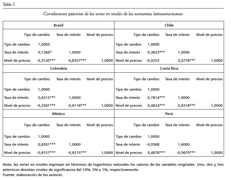 La tabla 3 muestra las correlaciones pairwise para las series de los países analizados; no obstante, hay escasa evidencia que confirme las correlaciones postuladas por las hipótesis de Fisher. La tabla muestra que solo en Chile y Costa Rica hay correlaciones significativas y positivas entre las tasas de interés y los precios, al igual que siempre hay correlaciones positivas y significativas entre las tasas de interés y los tipos de cambio. Por tanto, la evidencia sugiere que las correlaciones postuladas por la hipótesis de Fisher en su versión internacional no ocurren en ningún caso, al menos en el corto plazo15. La tabla 3 también permite identificar que en Costa Rica y Perú las apreciaciones de la moneda coinciden con incrementos en los niveles de precios.