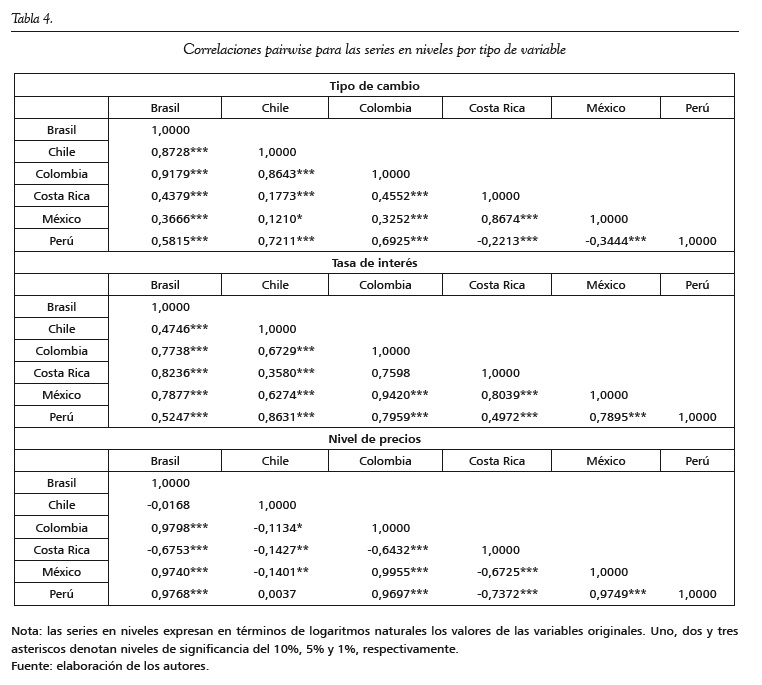La tabla 4 muestra las correlaciones pairwise para series de un mismo tipo y que hay correlaciones positivas y significativas entre los tipos de cambio y entre las tasas de interés de los países latinoamericanos16. Así, la evidencia sugiere que los tipos de cambio y las tasas de interés tienden a moverse conjuntamente entre sí, al menos en el corto plazo, al igual que los precios tienden a exhibir correlaciones significativas. Sin embargo, la existencia de correlaciones positivas y negativas sugiere que no hay movimientos comunes en las dinámicas de corto plazo de los precios. Así, la evidencia sugiere que las dinámicas de los precios son heterogéneas entre los países de la región.