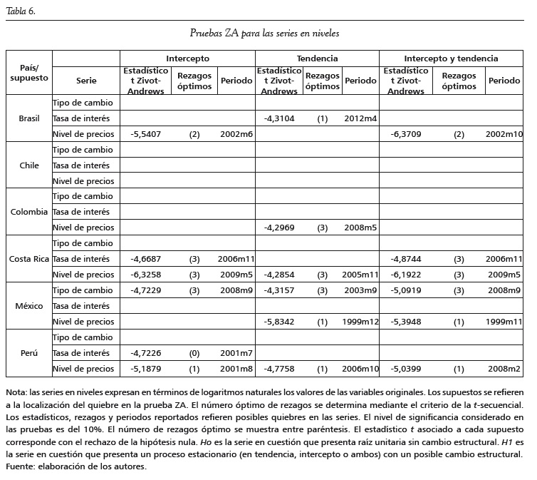 La tabla 6 muestra las estimaciones de las pruebas ZA usando los tres grupos de supuestos estadísticos considerados para cada una de las series. La evidencia sugiere la existencia de que hubo, al menos, un quiebre en nueve de las series durante el periodo analizado18. Particularmente, los tipos de cambio de México aparentemente tuvieron quiebres en 2003 y 2008. Las tasas de interés de Brasil, Costa Rica y Perú parecen haber tenido quiebres, respectivamente, en 2012, 2006 y 2001. Los precios de Brasil, Colombia, Costa Rica, México y Perú parecen haber tenido quiebres, respectivamente, en 2002, 2008, 2009, 1999 y 200119. Por tanto, la evidencia sugiere que solo Chile no experimentó ningún tipo de cambio estructural.
