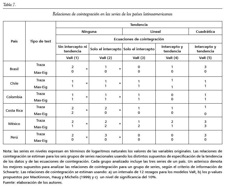 La tabla 7 también sugiere que las series nacionales no están integradas de la misma manera en el interior de los países de la región. Esta afirmación se sustenta con base en la contabilización de las relaciones de cointegración existentes para las series de cada país. Particularmente, en Costa Rica y México, el grado integración de los mercados nacionales es del 100%, en tanto en Chile y Colombia este se reduce a un 50%. Por tanto, si bien la evidencia muestra que hay cointegración en el ámbito nacional, también muestra que las variables económicas y financieras nacionales pueden tener dinámicas independientes de corto y largo plazos.
