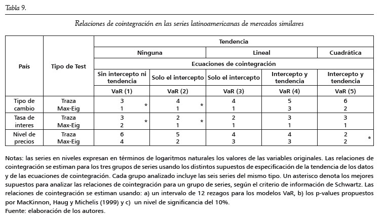 La tabla 9 sintetiza los resultados de las pruebas de cointegración para las series de los mercados latinoamericanos. Aunque estos confirman que hay movimientos y equilibrios comunes de largo plazo en los mercados de la región, las pruebas de cointegración de la traza y del máximo eigenvalor estiman números de relaciones de cointegración diferentes para las series de las tasas de interés y los tipos de cambio. El único grupo que registra coincidencias en los números es el que incluye series de precios; por tanto, la tabla sugiere que si bien hay evidencia en favor de la integración de los mercados latinoamericanos, esta se refleja principalmente en los mercados de bienes y servicios.