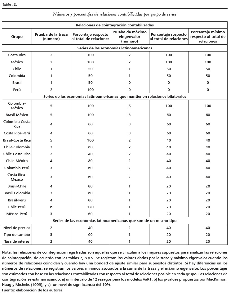 La tabla 9 también sugiere que los mercados latinoamericanos están integrados de una manera parcial y heterogénea. Esta afirmación se sustenta con base en la contabilización de las relaciones de cointegración existentes en los tres grupos de series. Particularmente, en el mercado de bienes y servicios el resultado de integración es del 40%. En lo que se refiere a los mercados monetarios y cambiarios, nuevamente la falta de coincidencia en las contabilizaciones de las relaciones de cointegración dificulta evaluar los porcentajes de integración de estos. Esta situación muestra que las políticas monetarias y cambiarias han tendido a ser independientes en la región latinoamericana.