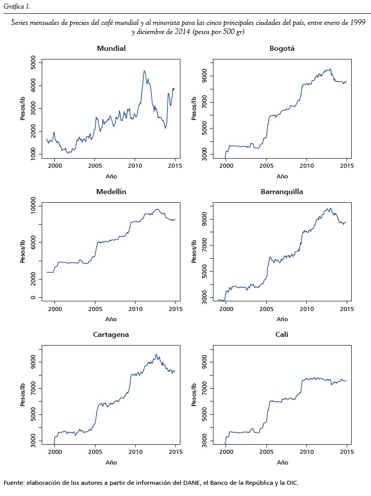 En este estudio se emplearán precios mensuales del café molido, pagados al minorista para el periodo enero de 1999 a diciembre de 2014, para las cinco principales ciudades de Colombia en número de habitantes: Barranquilla, Bogotá, Cali, Cartagena y Medellín. La muestra de precios mensuales nacionales provienen de la base de datos del Departamento Administrativo Nacional de Estadística (DANE), que es empleada para calcular el índice de precios al consumidor y corresponde al precio promedio del bien que es registrado por el DANE en los diferentes establecimientos de venta al detal de cada ciudad.