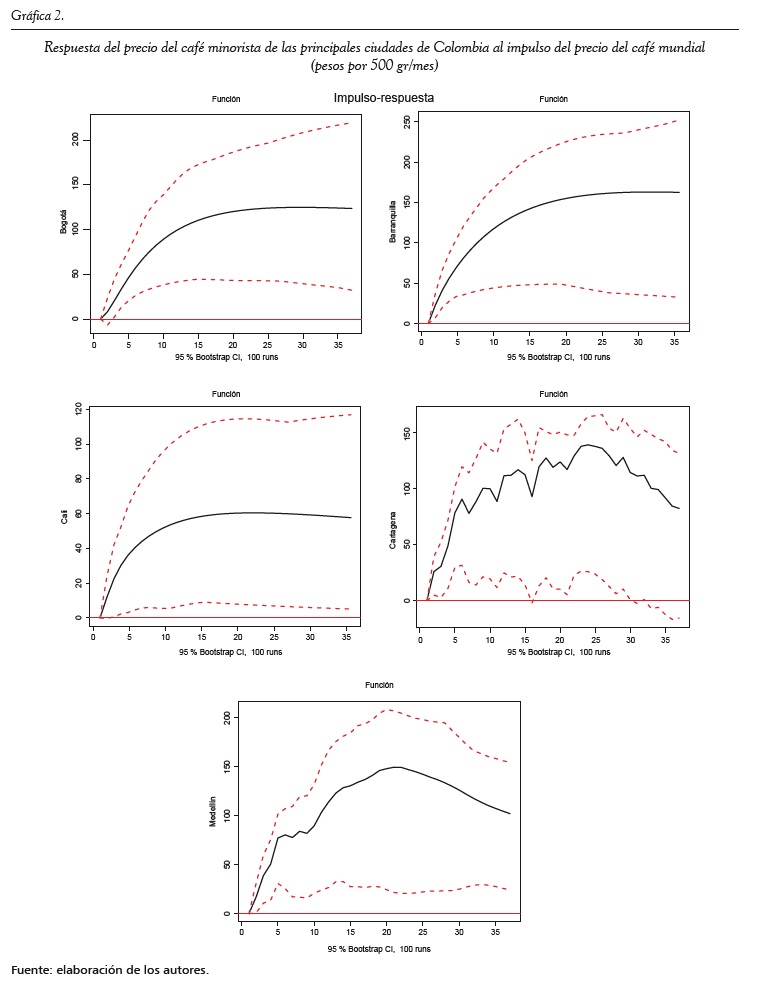 Por otra parte, la causalidad va del precio internacional hacia el precio pagado por los consumidores a los minoristas, lo que era de esperarse en la mayoría de los casos y, de hecho, es lo que refleja la literatura sobre el tema. Se encuentra también que los precios del café de los minoristas responden de forma diferente ante choques inesperados del precio internacional del café; en Barranquilla, Bogotá, Cali y Medellín los efectos desaparecen después de 36 o más meses, mientras que para los precios minoristas en Cartagena desaparecen en un menor periodo.