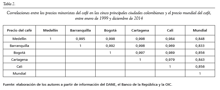El análisis realizado para el periodo enero de 1999 a diciembre de 2014 permite concluir que sí hay una relación de largo plazo entre los precios pagados a los minoristas del café en las cinco principales ciudades de Colombia y el precio internacional del café. Este resultado es importante, pues brinda evidencia de la existencia de una integración en la cadena del café; es decir, existe relación entre lo que ocurre en el mercado internacional y los mercados locales a escala minorista.