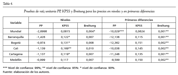 Los resultados anteriores también se obtuvieron con la prueba de Phillips y Perron (1988) y Breitung (1999) (tabla 4). Con la prueba KPSS (Shin et al., 1992) se rechaza la hipótesis nula de no raíz unitaria para el precio minorista del café en Barranquilla, Bogotá y Cartagena, con un 90% de confianza, y para Cali, con un 95%.