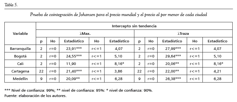La prueba de Johansen (1988) evidencia que hay una relación de largo plazo entre las series de los precios minoristas del café en las principales ciudades de Colombia y el precio mundial (tabla 5). La misma conclusión se puede obtener con la prueba de Engle y Granger (tabla 6). Dado que todas las series del café minorista están cointegradas con el precio mundial, se puede realizar la prueba de causalidad a lo Granger para todas las parejas de precios (tabla 6).