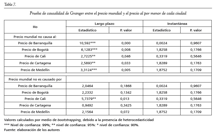 Los resultados muestran que no hay una causalidad instantánea entre el precio mundial del café y el precio del café minorista en las principales ciudades de Colombia. Por otro lado, sí hay causalidad unidireccional de largo plazo del precio mundial del café hacia el precio del café minorista de todas las ciudades (tabla 7). Solo en el caso de Cali se encuentra que los precios se mueven con anterioridad al precio mundial; de esta manera, se encuentra para Cali una causalidad bidireccional a largo plazo entre el precio mundial del café y el precio del café minorista.