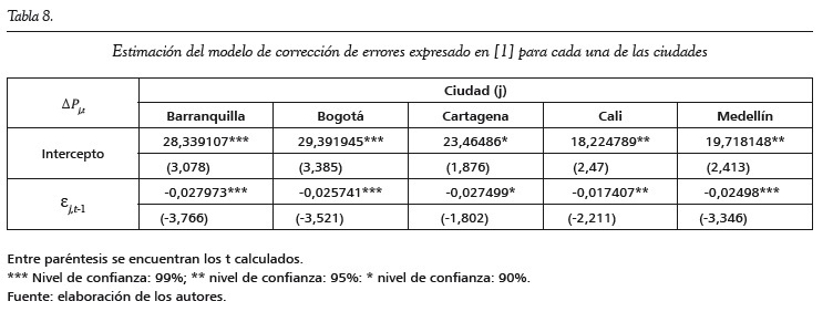,−1 es positivo en la expresión [1]), el sistema implicará que el precio local caerá para el siguiente periodo, de tal manera que el equilibrio de largo plazo se restablezca. En especial desviaciones del equilibrio de largo plazo para Barranquilla, Bogotá, Cali, Cartagena y Medellín son corregidas mensualmente en aproximadamente 2.8, 2.6, 1.7, 2.7 y 2.5 centavos de peso por cada peso de desequilibrio, respectivamente. Esas cifras corresponden al coeficiente del término de corrección de error de la ecuación [1]. En otras palabras, dejando todo lo demás constante, un desequilibrio inesperado toma en las ciudades de Barranquilla, Bogotá, Cartagena y Medellín alrededor de tres años (36 meses) para ser corregido. En Cali, se toman 4 años y 9 meses aproximadamente; es decir, esta ciudad presenta la velocidad de ajuste más baja.