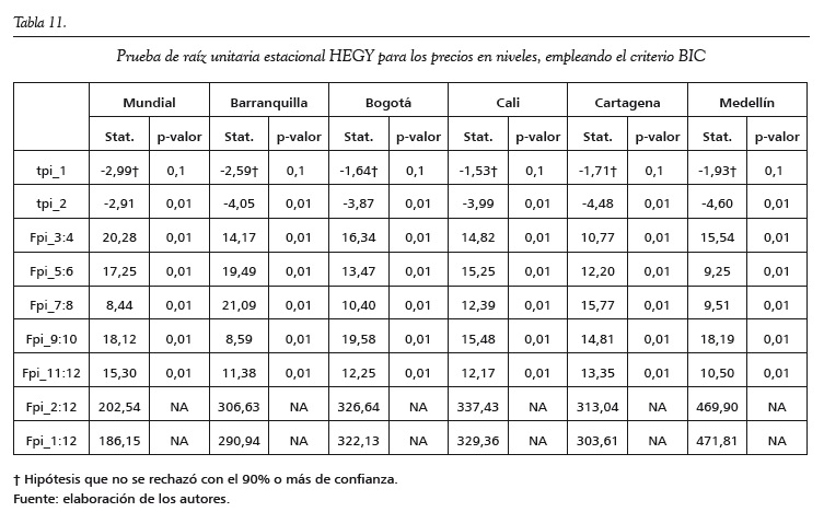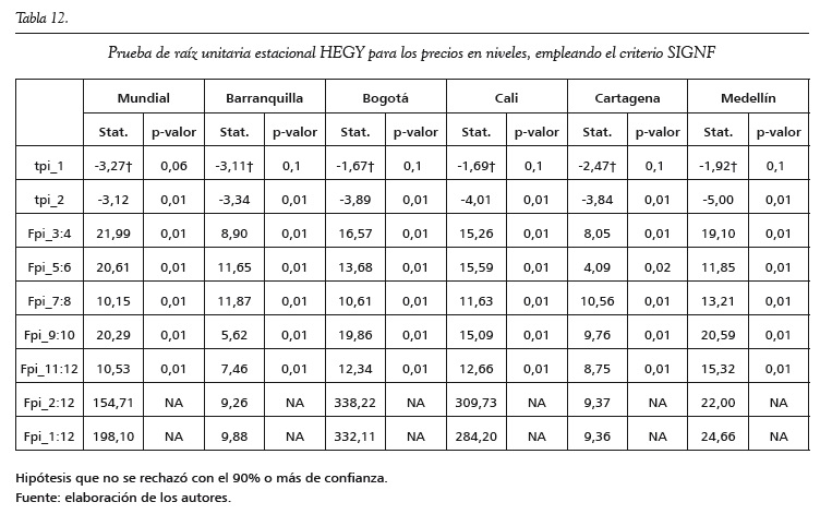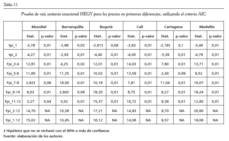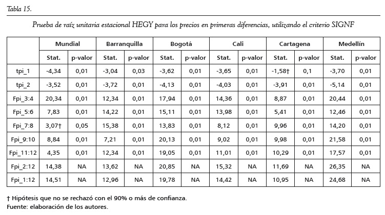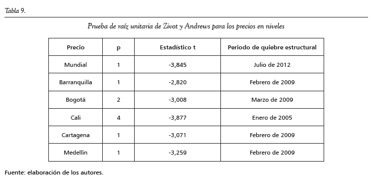 En los anexos se encuentran los resultados de aplicar las pruebas de raíces unitarias Zivot y Andrews (1992) y HEGY (Hylleberg et al., 1990). En la primera se observa que todas las series tienen un posible quiebre estructural: enero de 2005 para Cali, febrero de 2009 para Barranquilla, Cartagena y Medellín, marzo de 2009 para Bogotá y julio de 2012 para la serie mundial. Este quiebre estructural es tanto de la pendiente como del intercepto para todas las series, excepto para el precio del café de Cali, donde solo el intercepto fue significativo. Además, en todas las series no se rechaza la hipótesis nula de presencia de raíz unitaria. Para la prueba de HEGY, no se rechaza la hipótesis nula de raíz unitaria convencional y se rechazan todas las otras hipótesis con un 99% de confianza; es decir, no se encuentran raíces unitarias estacionales.