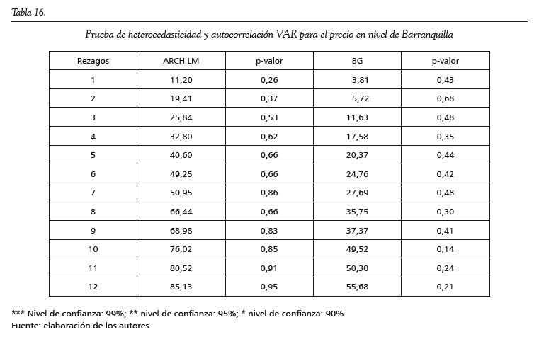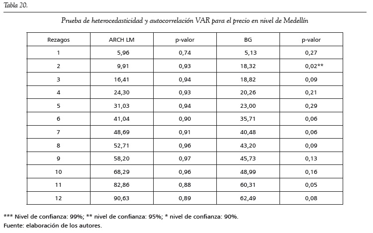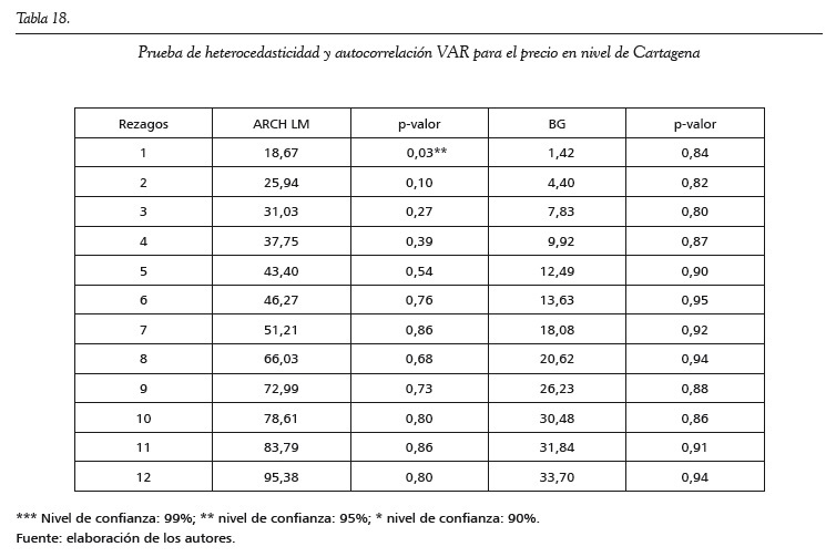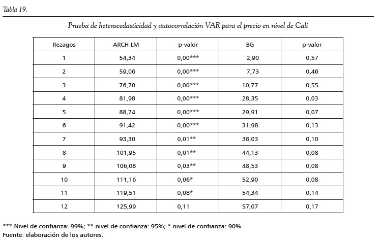 Para realizar la prueba de cointegración de Johansen (1988), se estima un modelo VAR para cada ciudad. Se establece el número de rezagos empleando criterios de información y posteriormente se realizan pruebas de autocorrelación y heteroscedasticidad para cada modelo. En todos los casos se logran obtener modelos VAR libres de autocorrelación, y solo en el caso de los modelos VAR para Cali y Cartagena las pruebas de ARCH LM y Breush-Godfrey señalan signos de heterocedasticidad condicional (ver anexos).