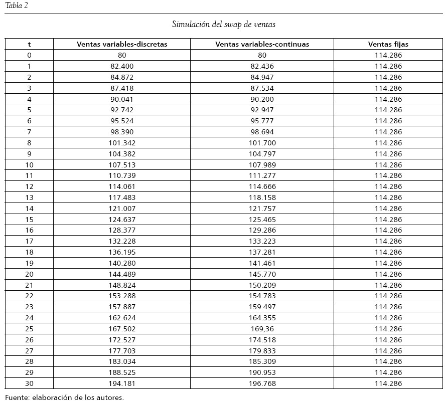 La primera puede lograrse con un swap de costos, mientras que la segunda es posible a través de un swap de ventas. Sin embargo, como las ventas se intercambian de variables a fijas, se necesita una estructura de costos que replique unas ventas fijas. Por ello, sería necesario implementar un swap de costos variables (es decir, que convierta costos variables a costos fijos). Como la fórmula de valor presente neto se encuentra en términos discretos, se utilizarán las fórmulas de los swaps en términos discretos: