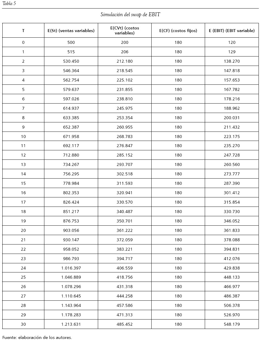 La tabla 5 muestra los datos de la estructura de pérdidas y ganancias proyectada antes de realizarse el swap sobre el EBIT.
