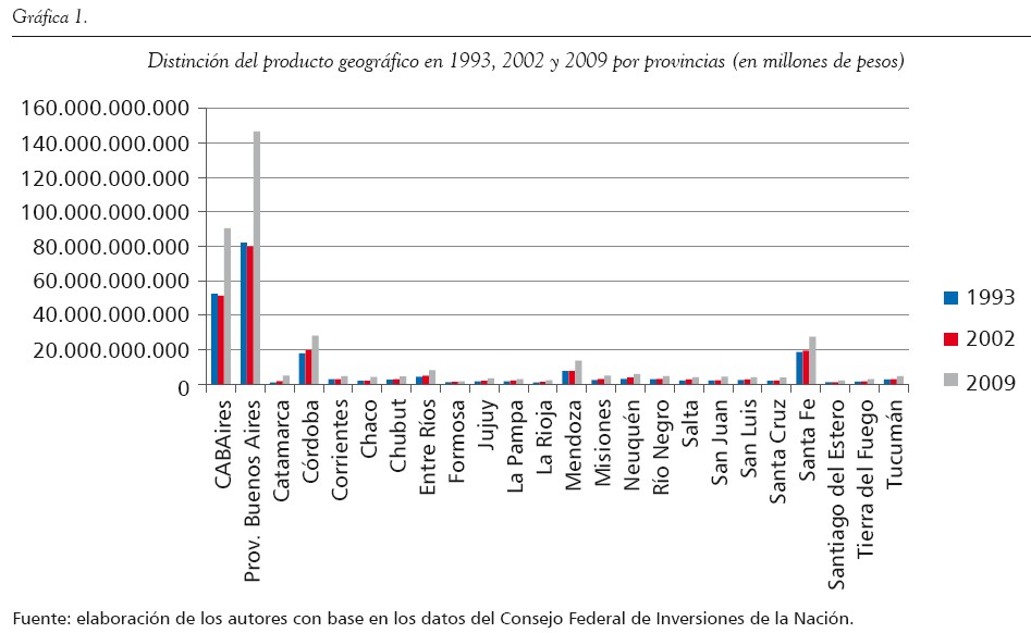 Tomando como referencia al mencionado producto bruto geográfico nacional, observamos que al comparar los valores que se presentan para cada una de las provincias, existen entre estas notables diferencias, con evidentes continuaciones desde 1993 hasta 2009. Así, por ejemplo, solo tres provincias del país (incluyendo la Ciudad Autónoma de Buenos Aires) representan el 76 % del producto bruto geográfico nacional, mientras que el resto del país apenas alcanza el 24 %, es decir, un cuarto del total. Más allá de algunas variaciones porcentuales mínimas, este promedio se mantuvo desde el año 1993 hasta el 2009.