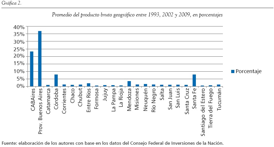 La provincia de Buenos Aires posee el 37 % del PBG nacional, seguida por la Ciudad Autónoma de Buenos Aires, con el 23 %, y muy por detrás de estos números las provincias de Córdoba y Santa Fe, que alcanzan, cada una, aproximadamente el 8 % del total. La provincia de Mendoza es la única que logra distanciarse, en pequeña medida, de todas las demás que podemos llamar periféricas o que están fuera del grupo de provincias centrales (Buenos Aires, CABA, Santa Fe y Córdoba), pues alcanza el 4 % del PBG, mientras que el resto no supera el 2 % (alcanzado solo por Entre Ríos y Neuquén). Para completar este análisis, hay 17 provincias de las 24 (incluyendo a la CABA) que apenas representan el 1 % del PBG. Por su parte, la gráfica 2 analiza los promedios generales en los años que se toman como referencia, en los porcentajes respectivos.
