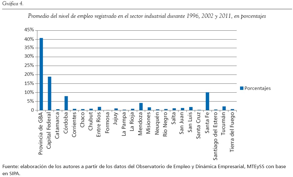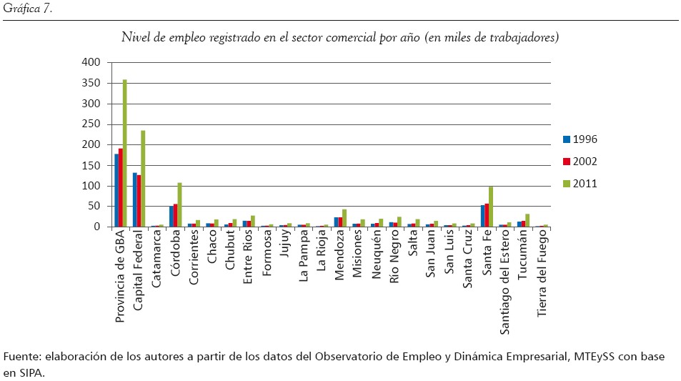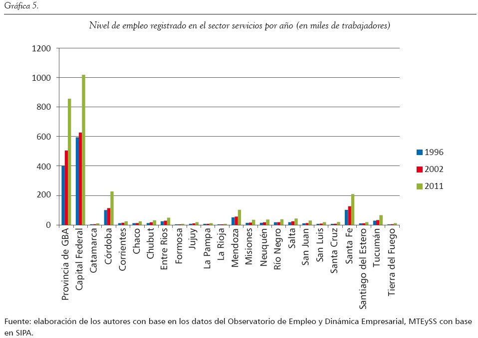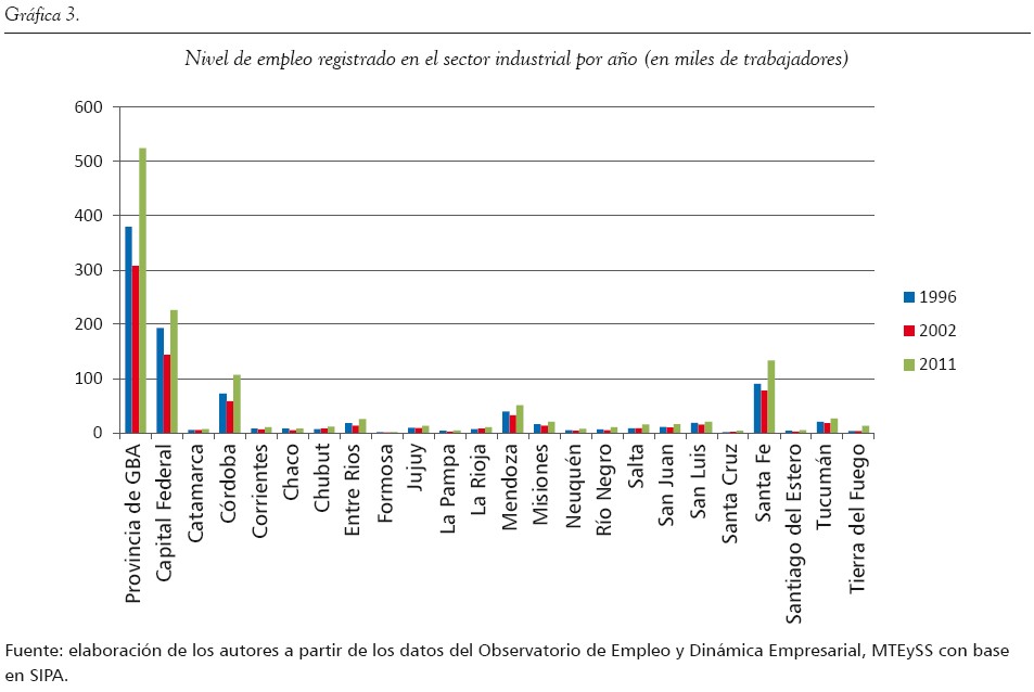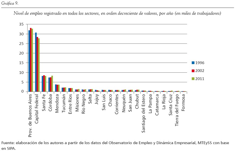 Consideramos fundamental el análisis de este factor, dado que la movilidad y el asentamiento poblacional en las distintas partes del territorio están fuertemente condicionados por la oferta laboral existente. Más allá de las riquezas propias de cada provincia del país (en lo que respecta a materias primas, minerales y recursos naturales), es pertinente evaluar el grado de desarrollo en los sectores secundarios (industriales) y terciarios (comercio y servicios), dado que requieren de mano de obra más capacitada y, por lo general, mejor reumenerada. En este sentido, tomamos como análisis el nivel de empleo partiendo desde los datos actuales aportados por el Ministerio de Trabajo de la Nación en cuanto al empleo registrado de los trabajadores bajo relación de dependencia en el sector privado (incluyendo las empresas estatales), especialmente en los sectores de industria, comercio y servicios. La comparativa se efectuó entre 1996, 2002 y 2011, y a partir de ello se observaron las continuidades o discontinuidades en el nivel de registración laboral por sector. No se consideró el empleo no registrado o informal, por las dificultades en su medición; no obstante, los datos tomados presentan una panorámica general interesante que contribuye a afirmar nuestro planteamiento central.