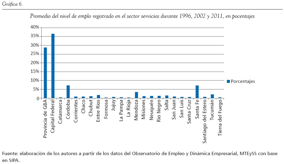 En segundo lugar, tomamos como referencia el sector servicios, donde, a diferencia del sector industrial, es la Ciudad Autónoma de Buenos Aires la que encabeza la lista con la mayor cantidad de trabajadores registrados, con un promedio total del 37 %. Lo cierto es que, más allá de esta diferencia, el panorama es bastante similar a las asimetrías que venimos observando. Nuevamente, como puede verse en las gráficas 5 y 6, la provincia de Buenos Aires (incluyendo la CABA), Santa Fe y Córdoba comprenden el 80 % de los puestos de trabajo total registrados en el país; el el 20 % restante se dispersa en las demás provincias, con menos del 2 % de incidencia en el total nacional.