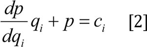 Where p is the market price of a homogenous good or service, q. the quantity produced by firm i, c the variable cost—constant—per unit produced by firm i, Fi. the fixed costs of firm i, and Q = Σni=1qi the total market production, being n the total number of firms that produce the good or service.