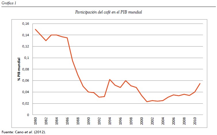 El desarrollo de la agroindustria, la aparición y consolidación de nuevos productos agrícolas, el avance de las manufacturas y la importancia del petróleo, la minería y sus derivados implicaron que la importancia relativa del café empezara a caer en el ámbito de la economía global. La gráfica 1 muestra la pérdida de participación del café en el PIB mundial durante los últimos treinta años, resultado del desarrollo y la diversificación de la economía global.