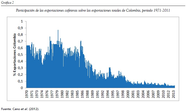 En el ámbito interno, el significativo crecimiento de otros sectores económicos del país (como el minero-energético), la aparición de otros cultivos de tardío rendimiento (como la palma de aceite, los frutales y las flores) y la producción y comercialización externa de otros alimentos procesados debilitaron la participación del café en el mercado nacional. Hacia finales de 1960, el café participaba con el 26 % del PIB del sector agropecuario y con el 3 % del PIB total; hoy solo participa con el 6 % del PIB agropecuario y con el 0,6 % del PIB total. La producción nacional paso de 16 millones de sacos de 60 kg en 1991-1992 a 7,8 millones en 2011. Las exportaciones de café pasaron de representar el 50 % entre 1970 y 1986 de las exportaciones totales del país a participar con el 5 % en 2011 (gráfica 2). Esto representó una pérdida de importancia del café en la balanza de pagos y en la dinámica cambiaria del país.