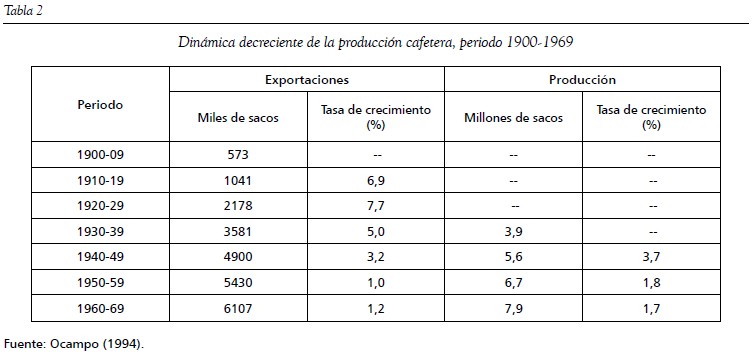 A comienzos de los años sesenta, la cosecha de café ascendía a 7,9 millones de sacos de 60 kg, un poco menos del triple de la producción registrada en la segunda mitad de la década de los años veinte (2,9 millones). Según Ocampo (1994), a pesar de este aparente panorama favorable, la dinámica de expansión en la producción cafetera fue cada vez menor: el crecimiento de la producción y las exportaciones de entre 6 % y 8 % anual significó un aumento rápido durante las primeras décadas del siglo XX; mientras que a partir de los años cuarenta empezó a crecer cada vez menos, hasta alcanzar menos de 2 % durante los años cincuenta y sesenta (tabla 2).