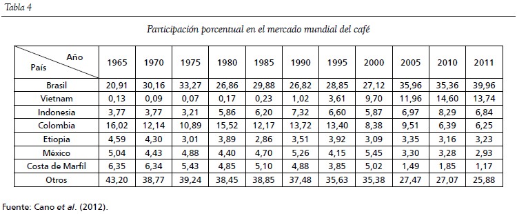 Después del rompimiento del Acuerdo Mundial del Café y el Pacto de Cuotas en 1989, Colombia fue quizás el único país que no logró aprovechar las ventajas y neutralizar las desventajas de esta coyuntura (Cano et al., 2012). El nuevo escenario mundial del café de libre competencia dejó sin mucha capacidad de maniobra a la Federación, pues jugaron en su contra la falta de preparación para afrontar esta nueva dinámica y el debilitamiento de algunas instituciones que en su momento apoyaron y defendieron la labor del gremio. Al mismo tiempo, la falta de modernización de las instituciones cafeteras para adaptarse al nuevo escenario económico mundial y a la globalización del comercio dificultó aún más la labor. Así, Colombia evidenció cómo la aparición de nuevos jugadores, como Vietnam e Indonesia, y el aumento de la participación en la producción mundial de Brasil le hicieron perder 7 % en la participación mundial de café. La tabla 4 muestra el comportamiento de la participación mundial de café del país: pasó de representar el 13,5 % de la producción mundial entre 1965 y 1995 a participar solo con el 7,6 % entre el 2000 y 2011. La tabla muestra además que países como Etiopía, México y Costa de Marfil perdían terreno, mientras Brasil, Vietnam e Indonesia ganaban participación mundial. Sin duda alguna, en este contexto, Colombia fue el país que resultó más damnificado: tuvo que replegarse en el quinto lugar de la participación mundial, cuando ocupó por muchos años el segundo puesto después de Brasil.