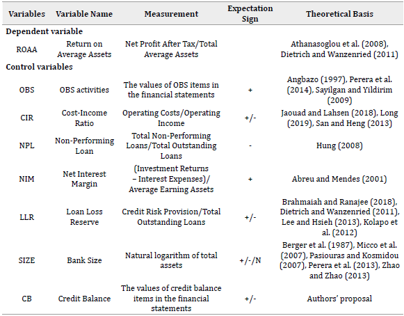 If the cost of funding rises due to a larger credit balance, ROAA may be adversely affected. The bank's ability to assess, manage, and mitigate credit risk is pivotal. If the bank fails to manage credit risk effectively, the credit balance could become a burden, negatively affecting ROAA by creating LLR and asset losses. Therefore, the authors have introduced variables into their research model (Table 1).