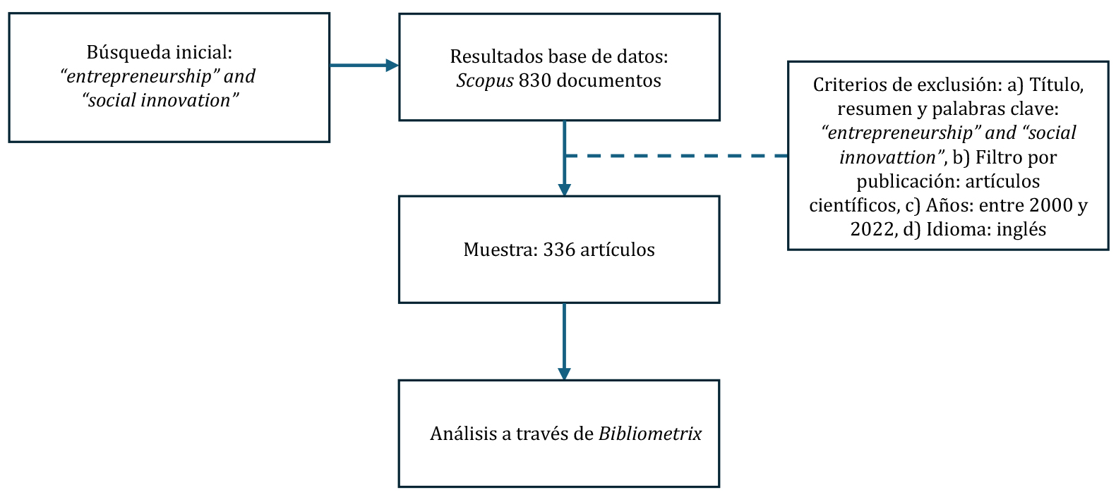 Posteriormente, para filtrar la búsqueda pertinente con la investigación, se integraron criterios de exclusión, primero, documentos cuyo título, resumen y palabras claves han hecho mención a entrepreurship y social innovation, con la inserción del operador booleano AND, el periodo de publicación entre 2000 a 2022, el filtro por publicación donde se han fijado artículos científicos divulgados y, finalmente, el idioma, con artículos publicados únicamente en inglés. Así pues, se ha limitado la búsqueda a 336 documentos y la generación de la siguiente ecuación de búsqueda: (TITLE-ABS-KEY ["entrepreneurship"] AND TITLE-ABS-KEY ["social innovation"]) AND PUBYEAR > 2000 AND PUBYEAR < 2022 AND (LIMIT-TO [DOCTYPE , "ar"]) AND (LIMIT-TO [LANGUAGE , "English"]).