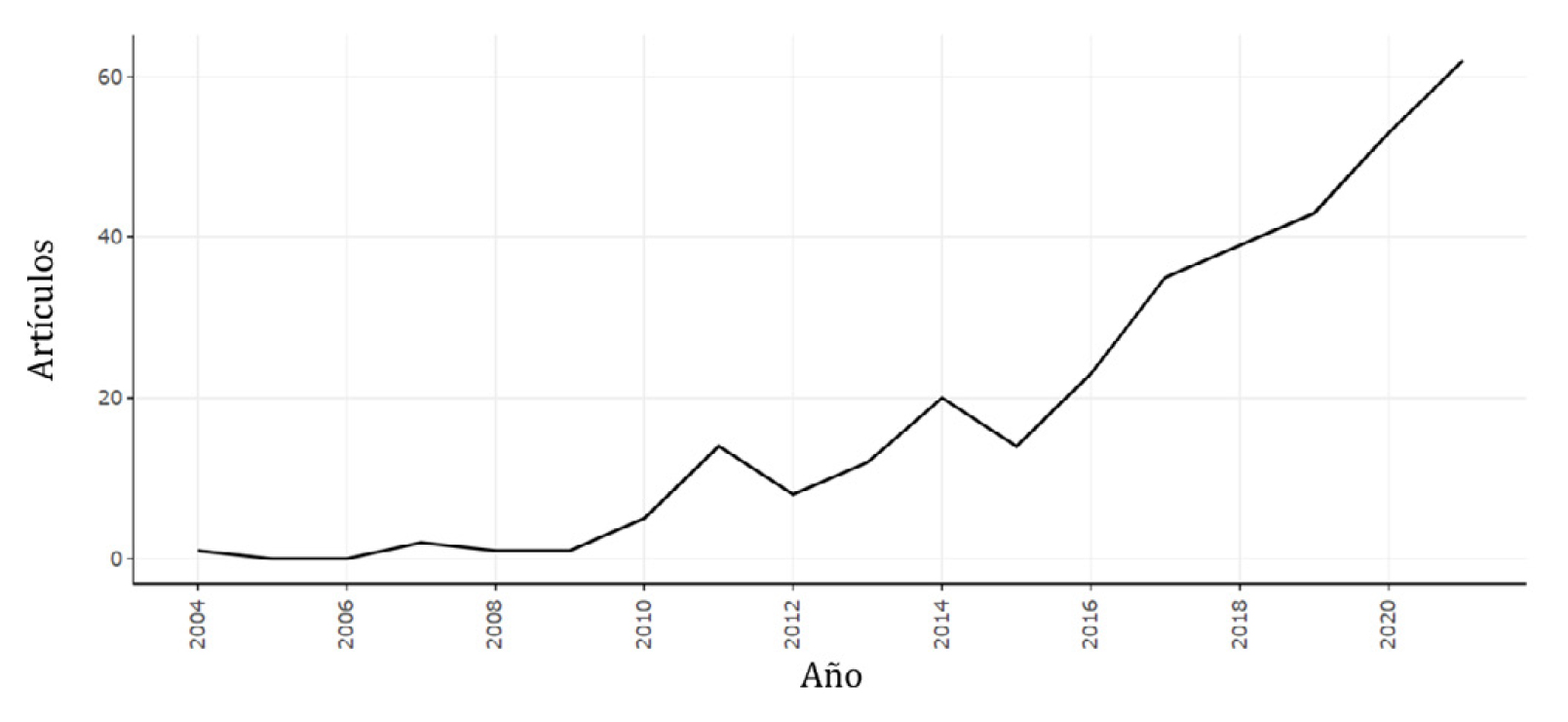 De acuerdo con la Figura 2, las publicaciones mantuvieron un comportamiento constante entre los años 2004 a 2009, a partir de este último año se evidencia una tendencia alcista en los procesos de publicación hasta el año 2011, en donde caen en una baja proporción; luego se aprecia un comportamiento similar entre 2013 y 2017, cuando posteriormente suben nuevamente el número publicaciones hasta el año 2022. En términos generales, se evidencia que las publicaciones comienzan una tendencia alcista desde el año 2009 y cerca al año 2022.