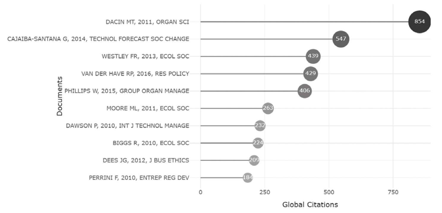 Para llevar a cabo el análisis bibliométrico a través del software Bibliometrix correspondiente a "entrepreneurship" y "social innovation", con la inserción del operador booleano AND, se ha limitado la búsqueda de acuerdo con la pertinencia de la investigación; bajo esta caracterización se analizan el número de publicaciones, publicaciones por recurso de publicación, los documentos por autor, los documentos de acuerdo con el territorio de procedencia del autor, los documentos por área, los artículos con la mayor citación global, la red de coocurrencia de conceptos y la nube de palabras.