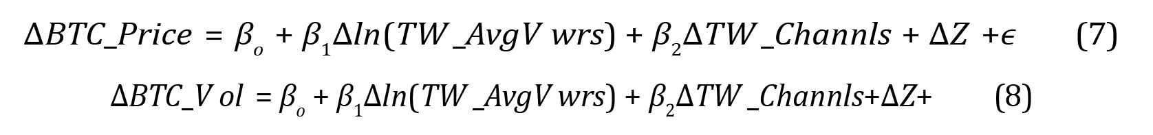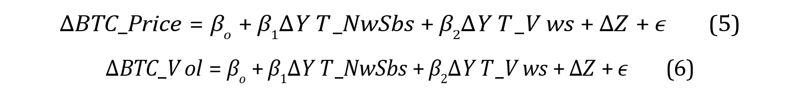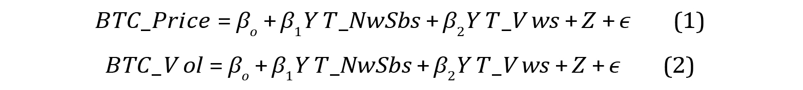 Tables 4, 5, and 6 show the results of the proposed models. The first model has the first difference in Bitcoin price as the dependent variable, while the second model has the first difference in Bitcoin volume as the dependent variable. As independent variables, in both models, we have the number of new subscribers in channels with content associated with Bitcoin and the number of new views in channels of this topic, together with the control variables previously mentioned in Section 3. In both models, AY T _NwSbs has a positive and statistically significant impact on the price of Bitcoin. The foregoing implies that an increase of 1,000 subscribers from one week to the next (first difference) produces an average effect of $21 on the price of Bitcoin.