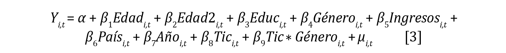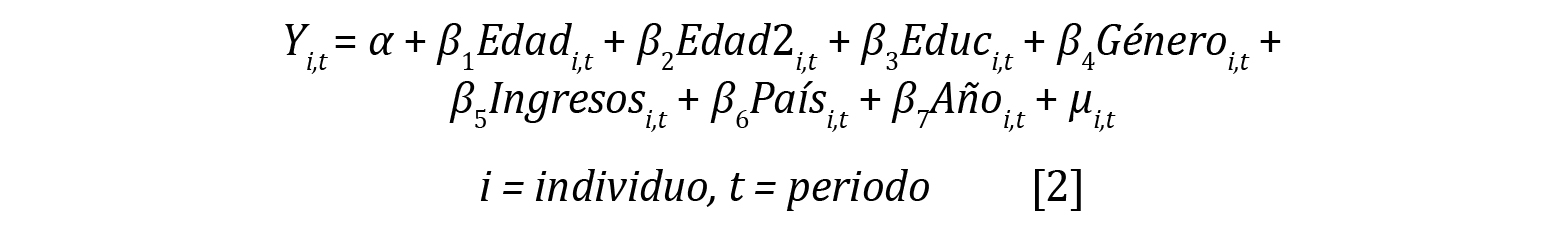 En donde Yi,t ,t representa si el individuo en el momento t está o no incluido financieramente, Xi,t son las variables independientes y μi,t es el término de error. Luego, la probabilidad de que el individuo esté incluido financieramente está determinada por la edad, edad al cuadrado, educación, género, ingresos, país y año.