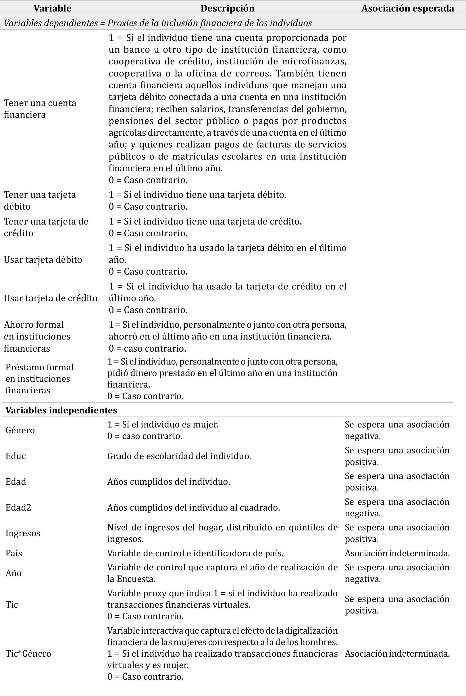 Dado que las encuestas de Global Findex proporcionan información sociodemográfica distinta cada año, y que las condiciones de los países de ALC presentes en la encuesta son variables, los modelos logit incluyeron la información disponible en los cuatro momentos de tiempo (2011, 2014, 2017 y 2021); así, las variables proxy de IF son: tenencia de cuenta financiera, tenencia de tarjeta débito, tenencia de tarjeta de crédito, uso de tarjeta débito en el último año, uso de tarjeta de crédito en el último año, tenencia de ahorro formal y tenencia de préstamo formal en el último año; edad, ingreso, nivel educativo, nivel de ingresos y proxy de uso de TIC1 de individuos pertenecientes a los países de Argentina, República Dominicana, Costa Rica, El Salvador, Honduras, Nicaragua, Panamá, Bolivia, Brasil, Chile, Colombia, Ecuador, Perú y Uruguay (Tabla 1).