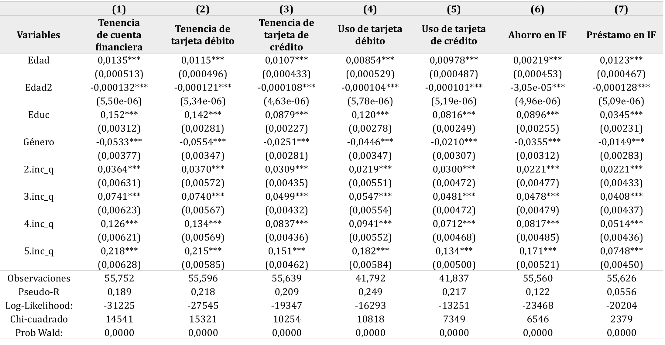 Los modelos estimados para medir la probabilidad que tiene un individuo de acceder a los diferentes servicios financieros, así como hacer uso de ellos, presentan evidencia estadística en ALC de la asociación positiva entre la IF y las variables de edad (aunque con un efecto marginal decreciente), nivel educativo, nivel de ingresos y uso de TIC, así como de la asociación negativa entre la IF y el género, con sesgo contra las mujeres, pues las latinoamericanas tienen menor probabilidad de acceder a una cuenta financiera, a una tarjeta débito o crédito, de usar dichas tarjetas o de usar los servicios de ahorro y préstamo formales.