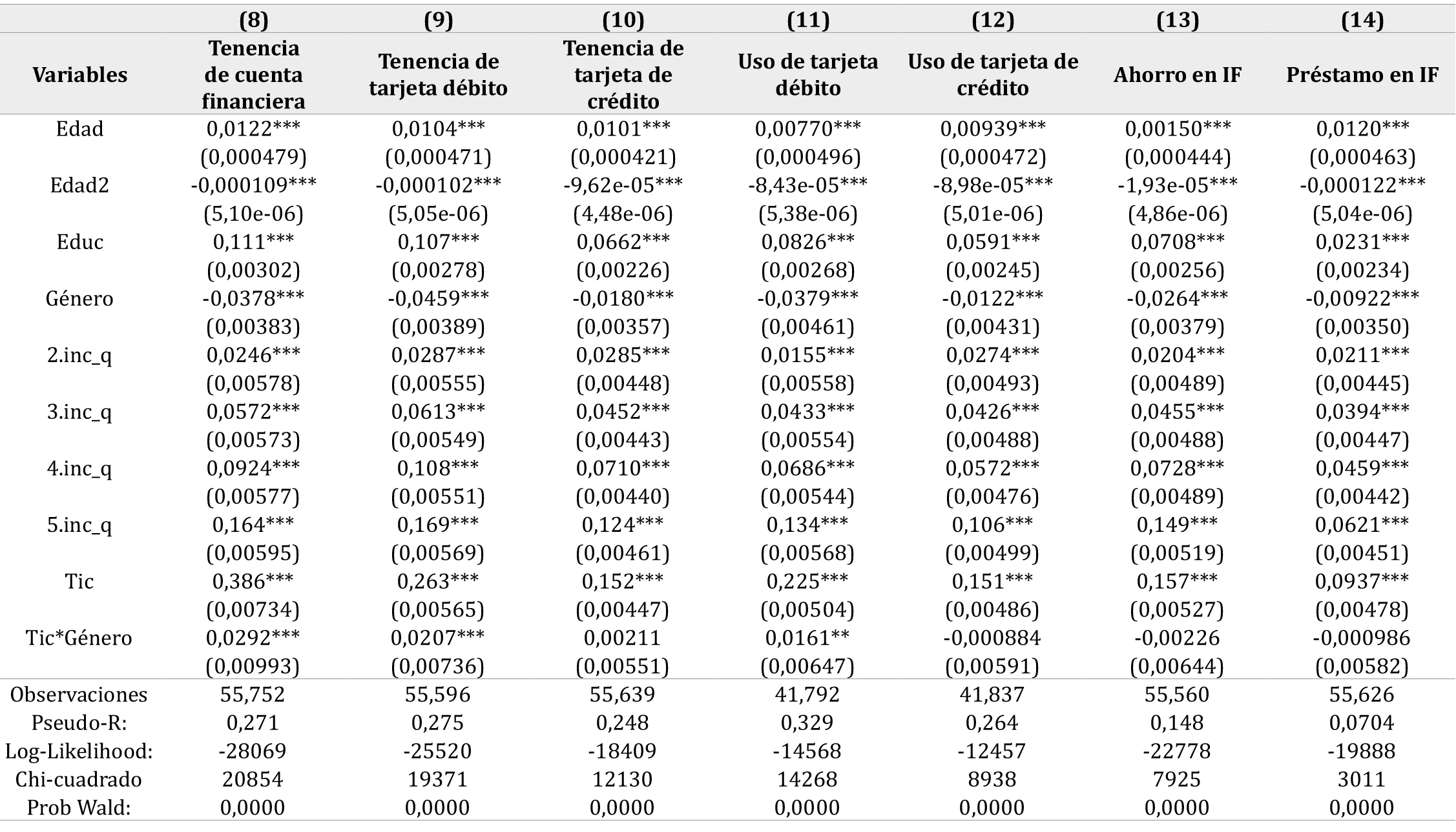 De otra parte, con el propósito de conocer la influencia de las TIC en la IF y particularmente en IF de las mujeres, las regresiones iniciales (1-7) fueron complementadas con una variable proxy de uso de TIC y una variable interactiva de uso de TIC y género (Tabla 4). De ese modo, las nuevas regresiones (8-14) mostraron tener significancia conjunta, y también muestran que las variables de interés como edad, edad al cuadrado, nivel educativo, nivel de ingresos y uso de TIC son estadísticamente significativas al 1% de significancia. Sin embargo, la variable uso de TIC y género resultó ser estadísticamente significativa solamente en las regresiones de tenencia de cuenta financiera y tarjeta débito al 1% de significancia, y en la de uso de tarjeta débito al 5% de significancia. Es oportuno señalar que los efectos marginales del segundo conjunto de modelos se redujeron en comparación con los del primer conjunto, aunque, por lo general, no variaron su dirección.