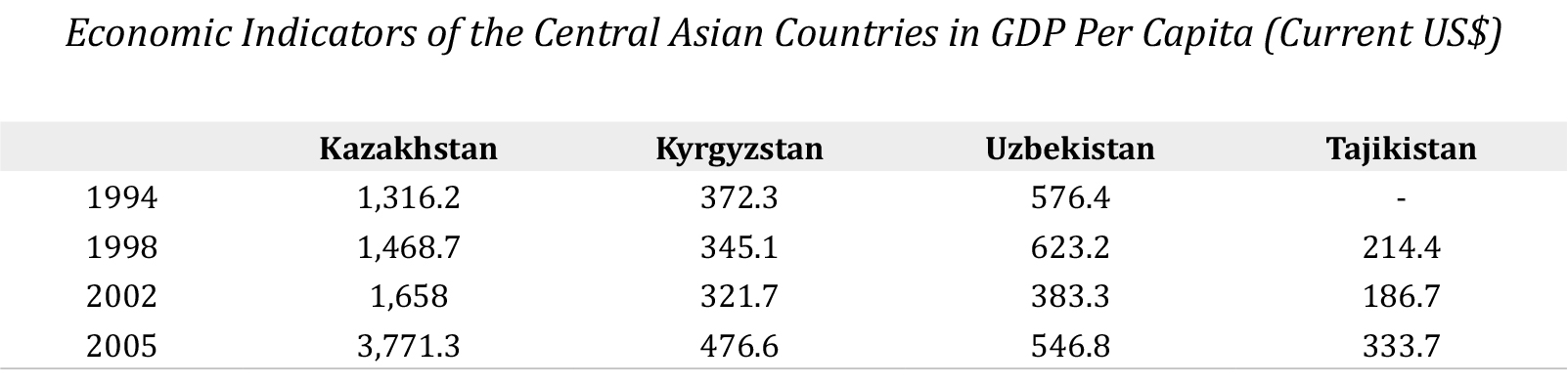 Table 1. Economic Indicators of the Central Asian Countries in GDP Per Capita (Current US$)