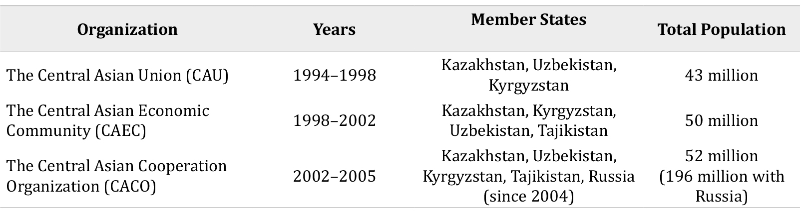 The development of regional integration processes in Central Asia started when Kazakhstan and Uzbekistan signed the Treaty on creating a common economic space on January 10, 1994, with the Kyrgyz Republic joining it a week later. Initially, the countries aimed to develop regional integration according to the model of the European Union (Pomfret, 2009). The states had quite ambitious plans for economic integration in the region. They agreed on undertaking joint efforts in economic reforms, developing a market economy, and establishing mutually beneficial economic relations (see Table 1). This included creating necessary conditions for advancing economic integration, forming a common economic space with free movement of goods, services, capital, and labor, and jointly coordinating fiscal, tax, customs, and monetary policies (Kazhenova, 2021). These initiatives marked the beginning of integration processes in Central Asia, eventually leading to the establishment of the CAU (see Table 2). Within the CAU, the Interstate Council was established at the level of Heads of State, the Council of Prime Ministers, the Council of Foreign Ministers, and the Council of Defence Ministers (Kembayev, 2006).